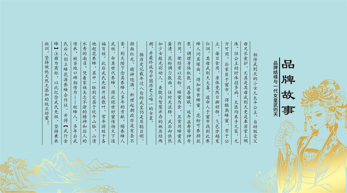 【武行金蜂】堅持秉承祖訓,堅持做純天然無添加的純正好蜜,我們提出“世代蜂農·天賜純漿”的口號,貫徹品牌整體定位。