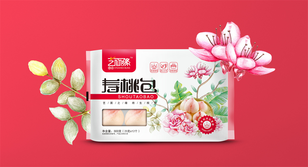常見的冷凍面點傾向于用實物產(chǎn)品攝影,或者是開窗鏤空的操作方式。為了體現(xiàn)產(chǎn)品差異,經(jīng)過對產(chǎn)品的分析,發(fā)現(xiàn)這幾個系列產(chǎn)品都與植物有關(guān)系,于是在藝面緣包裝設(shè)計上,采用彩鉛插畫與攝影的結(jié)合,大面積的留白之上,搭配原創(chuàng)的字體和插畫,放在終端市場 ,吸引力與美貌并存。