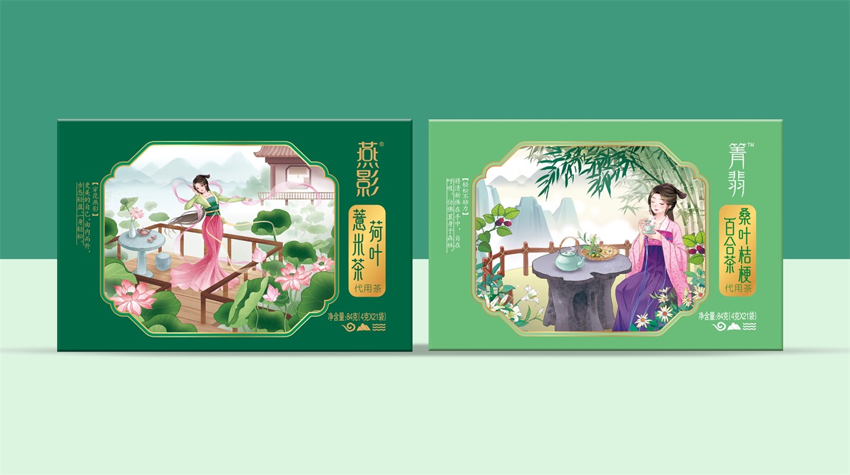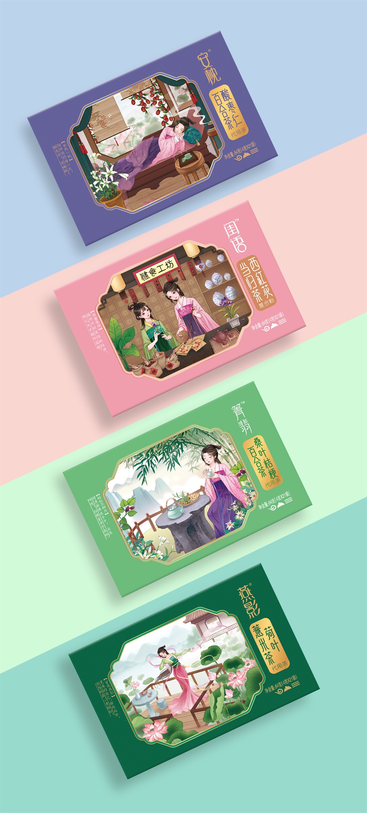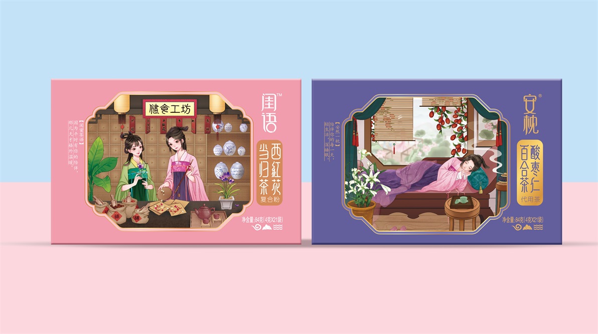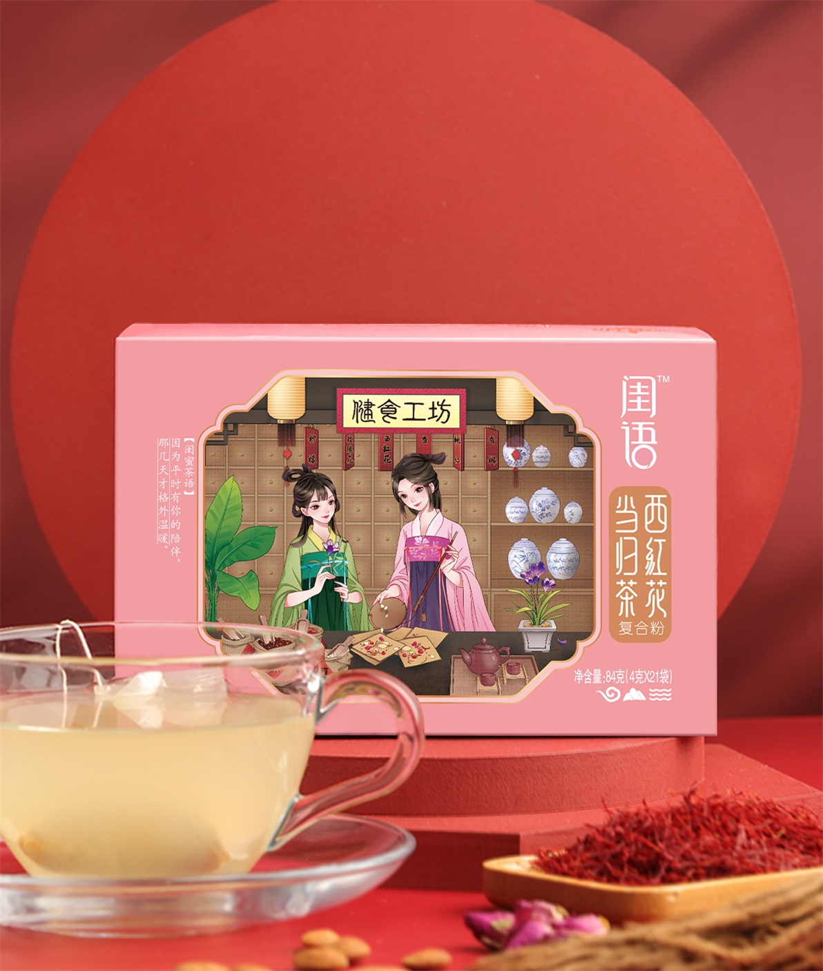 四款產(chǎn)品隸屬健食工坊品牌,又是中藥茶,第一能想到的畫面就是中藥鋪,中藥,但是老中醫(yī)給人的感覺過(guò)于沉悶,我們將打破固有思維創(chuàng)作。閨語(yǔ)對(duì)應(yīng)的產(chǎn)品是西紅花當(dāng)歸茶。閨語(yǔ)就是閨蜜之間的小秘密,至此插畫的畫面呼之欲出。在一間叫健食工坊的中藥鋪里,兩個(gè)古代的小閨蜜邊訴說(shuō)閨語(yǔ),邊仔細(xì)的挑選著藥材,我們將西紅花當(dāng)歸茶的主要配料用吊牌形式進(jìn)行展示跟品名進(jìn)行呼應(yīng)。