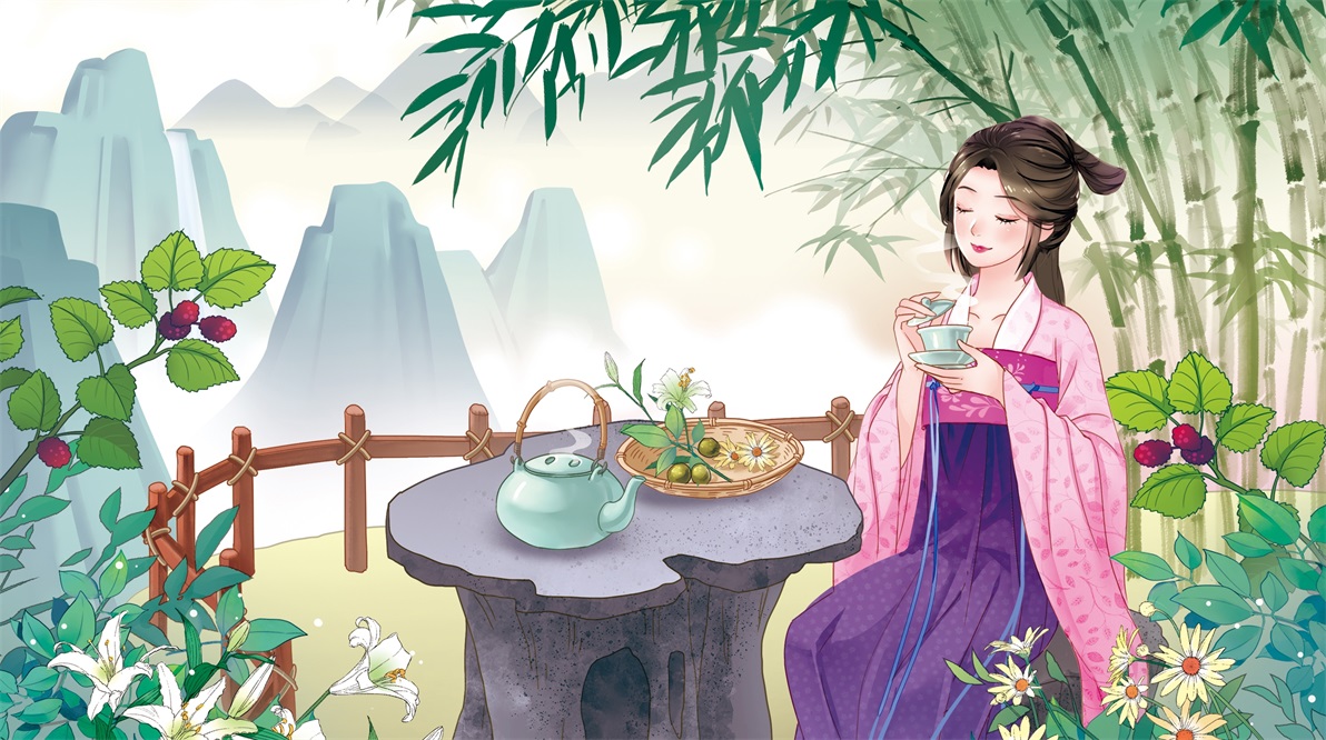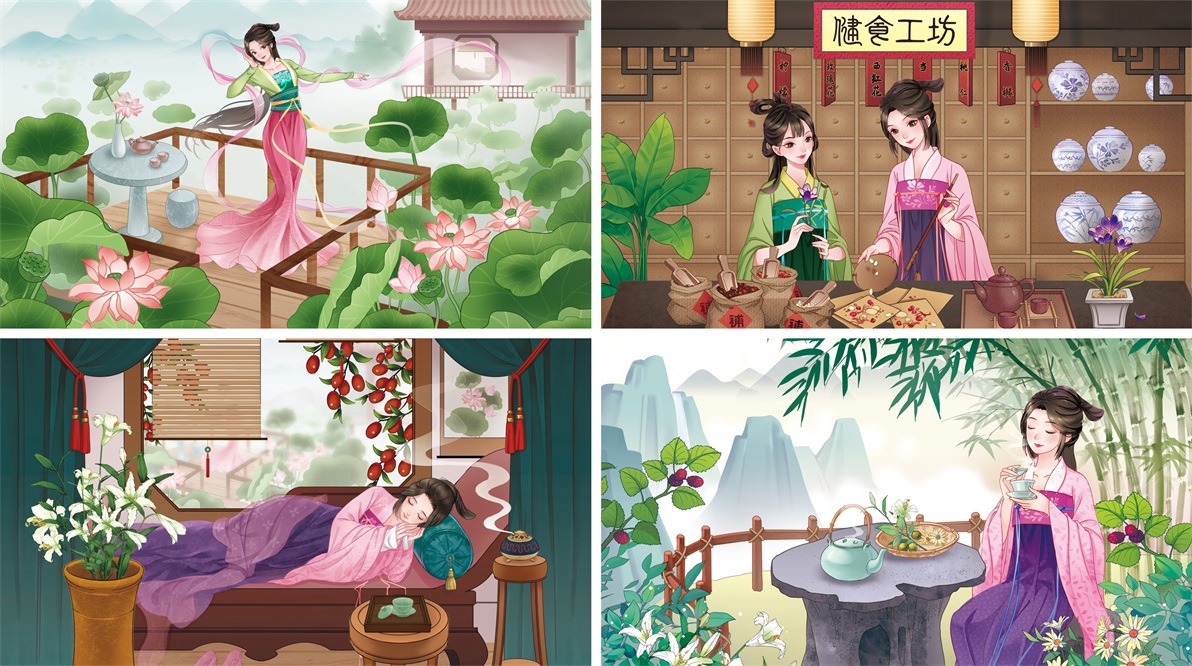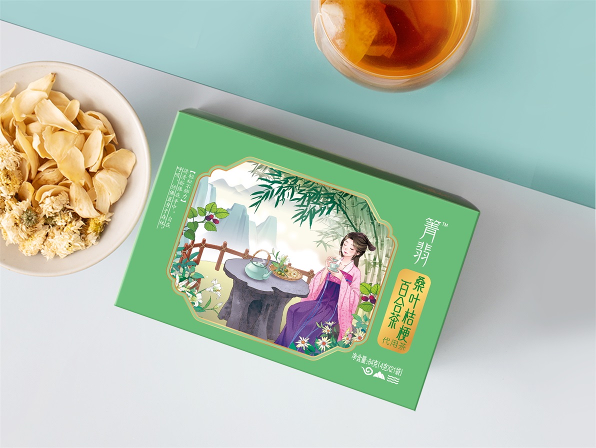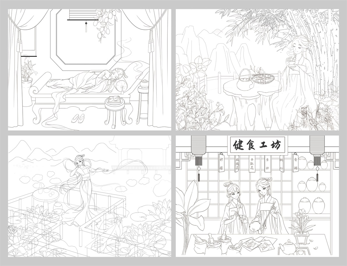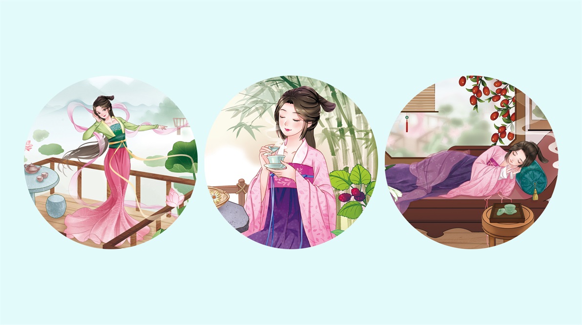 四款產(chǎn)品隸屬健食工坊品牌,又是中藥茶,第一能想到的畫面就是中藥鋪,中藥,但是老中醫(yī)給人的感覺過(guò)于沉悶,我們將打破固有思維創(chuàng)作。閨語(yǔ)對(duì)應(yīng)的產(chǎn)品是西紅花當(dāng)歸茶。閨語(yǔ)就是閨蜜之間的小秘密,至此插畫的畫面呼之欲出。在一間叫健食工坊的中藥鋪里,兩個(gè)古代的小閨蜜邊訴說(shuō)閨語(yǔ),邊仔細(xì)的挑選著藥材,我們將西紅花當(dāng)歸茶的主要配料用吊牌形式進(jìn)行展示跟品名進(jìn)行呼應(yīng)。