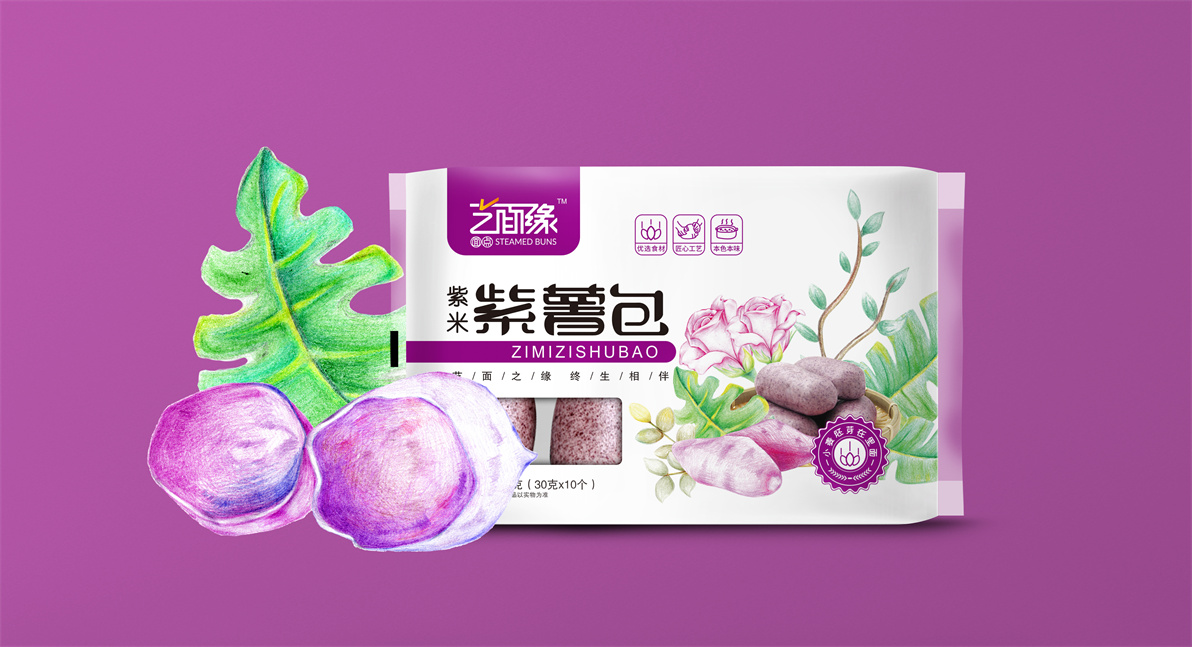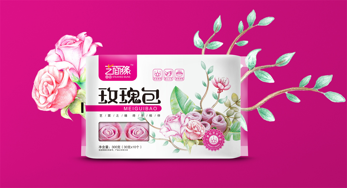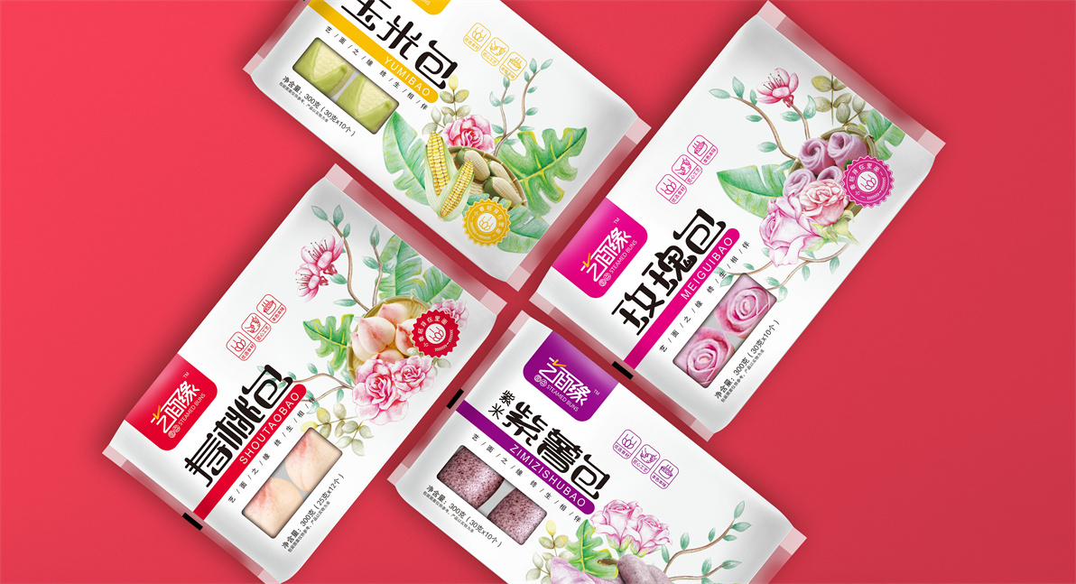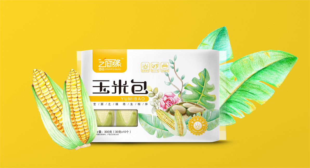 常見的冷凍面點傾向于用實物產(chǎn)品攝影,或者是開窗鏤空的操作方式。為了體現(xiàn)產(chǎn)品差異,經(jīng)過對產(chǎn)品的分析,發(fā)現(xiàn)這幾個系列產(chǎn)品都與植物有關(guān)系,于是在藝面緣包裝設(shè)計上,采用彩鉛插畫與攝影的結(jié)合,大面積的留白之上,搭配原創(chuàng)的字體和插畫,放在終端市場 ,吸引力與美貌并存。